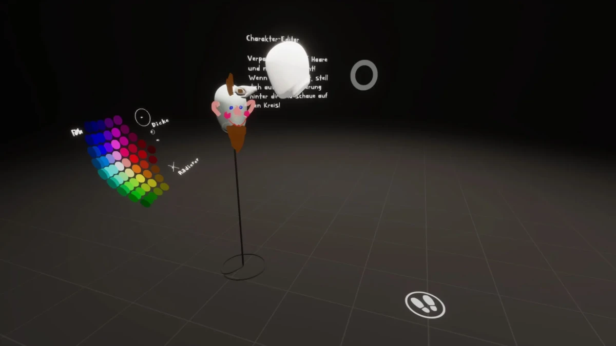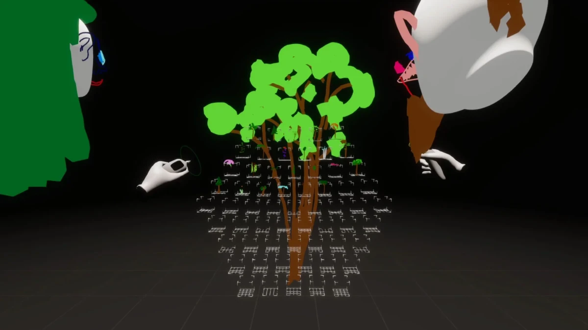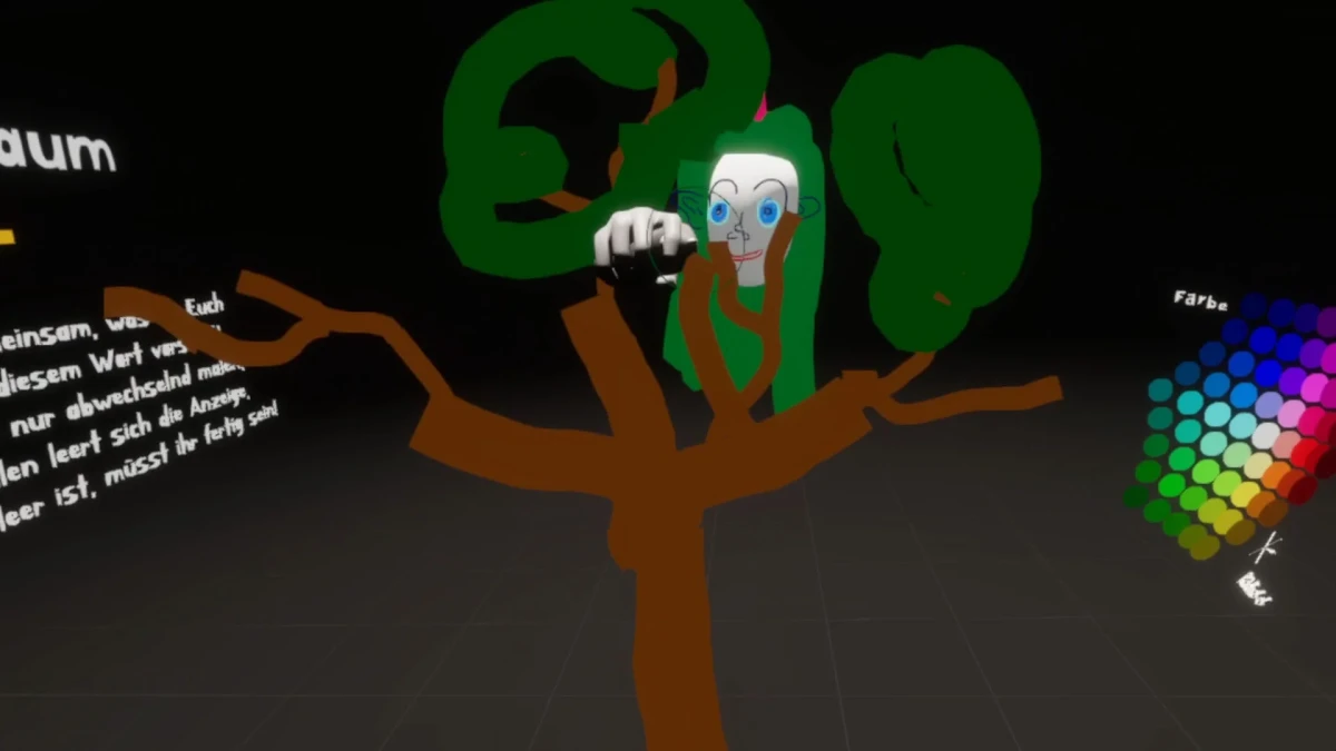 We all have images in our heads. When we imagine something specific, we see the corresponding image in front of our inner eye. The interesting thing - for everyone this inner picture looks a little different, even if we imagine the same thing. *Zwei malen Eins* is a VR application for two people, where the aim is to communicate about one's individual inner images. Together, words are being interpreted and ultimately a common picture is created. Two users meet in virtual space. They take turns drawing - in front of themselves, around themselves and about themselves. They have to discuss and work together, because they only have a limited amount of time for the joint visualization of their combined inner images. Once they reach the end, a gallery awaits them. A collection of previous interpretations of the same term allows for drawing comparisons, recognizing patterns, and reflecting on themselves. Beyond the fun gaming aspect of the application, "Zwei malen Eins" is also intended to encourage the participants to address more profound topics and to compare their views with those of their counterparts.